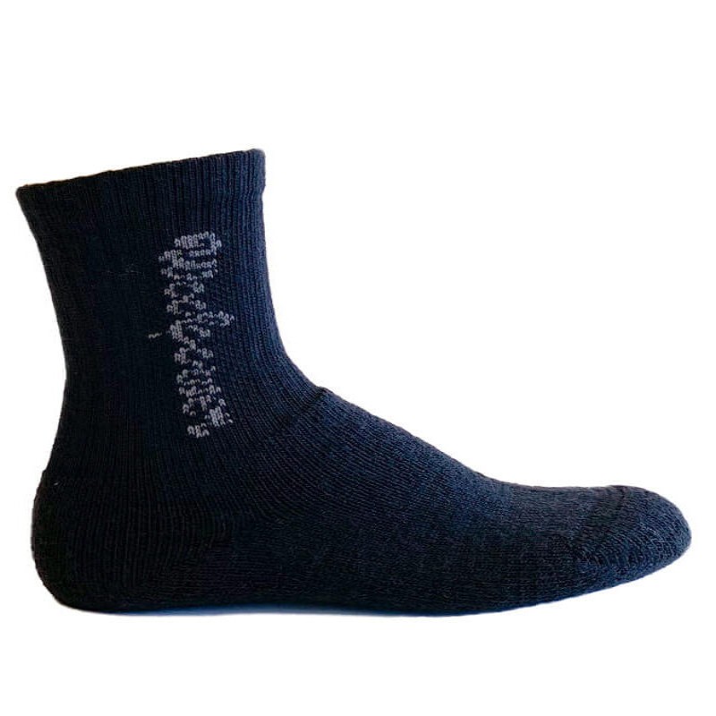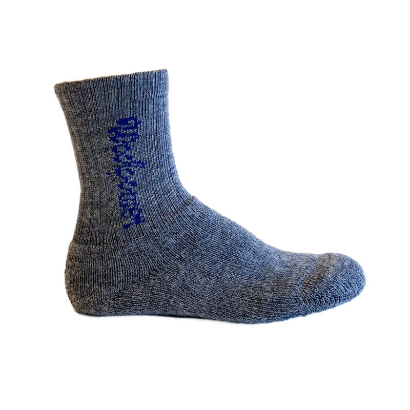 Socks have terry-knit feet and rib-knit shafts and a knitted Woolpower logo on the shaft.